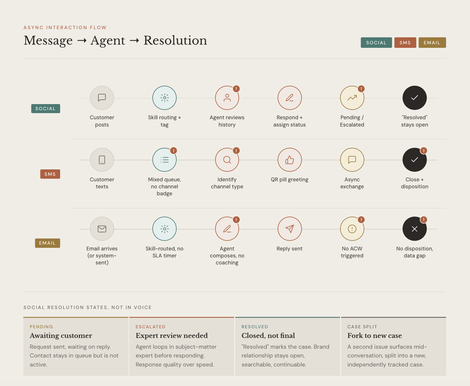 Async channels share a queue with voice but resolve differently, requiring consistent closure patterns, channel-aware status models, and persistent case history as core design requirements, not enhancements.